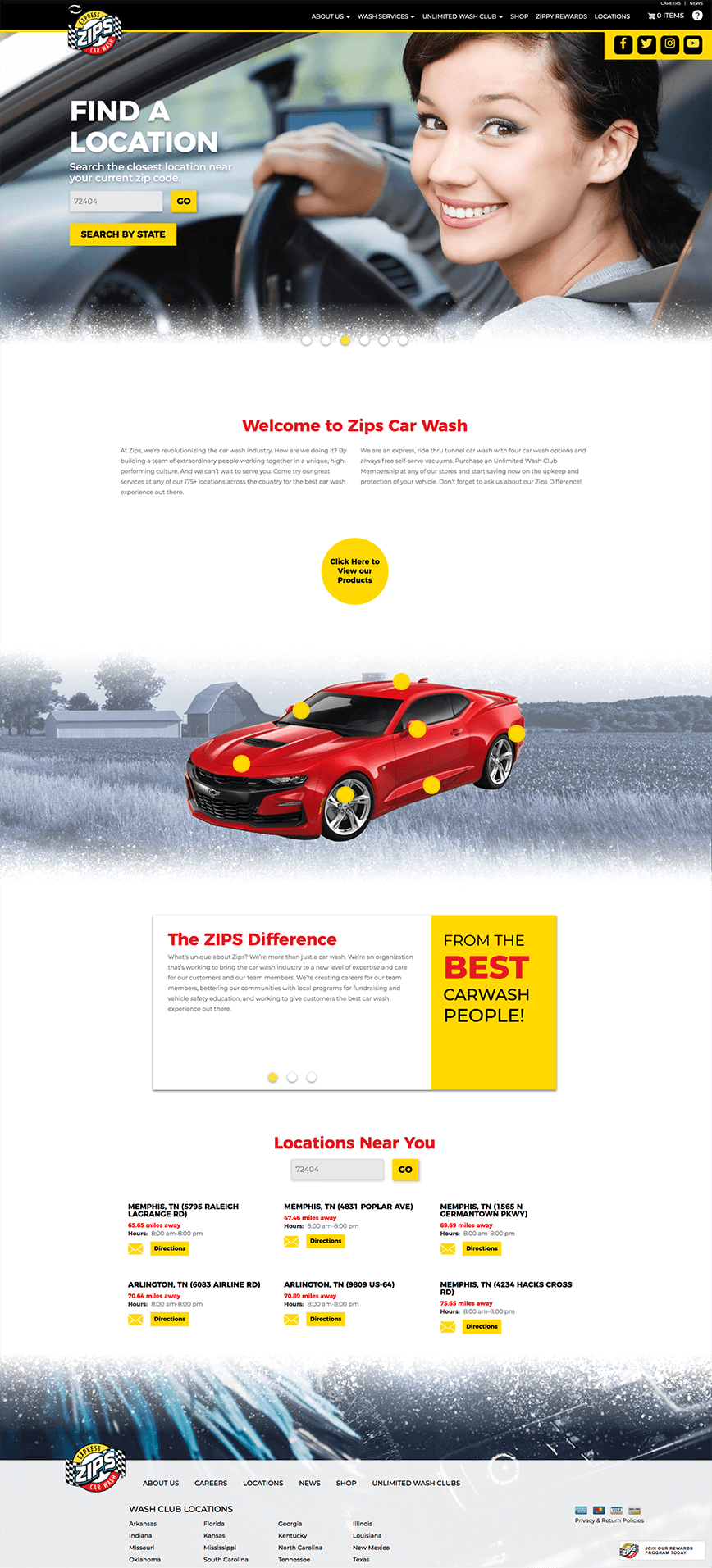 Zips Car Wash wanted a re-design of their current website that captured their audience's attention while also offering helpful information about their products and services. With multiple stores nationwide, they needed a site that was able to offer location-specific services to their customers. The site is able to detect your location which then updates the site throughout based on that information so that you are always up-to-date for the services in your area.